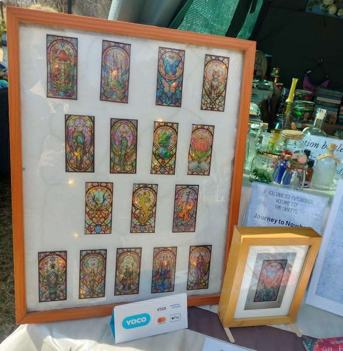 The Adventures of Mystic & Sage series is available as e-books from major online retailers, with physical copies also stocked in select shops and at our shop when we're at events and festivals. Beyond the books, our travelling shop brims with treasures, from bookmarks, stickers, and fridge magnets to stained-glass style art, "magic potion" bottles, vintage tins, and more. Visit us at the next event to explore the wonders for yourself!